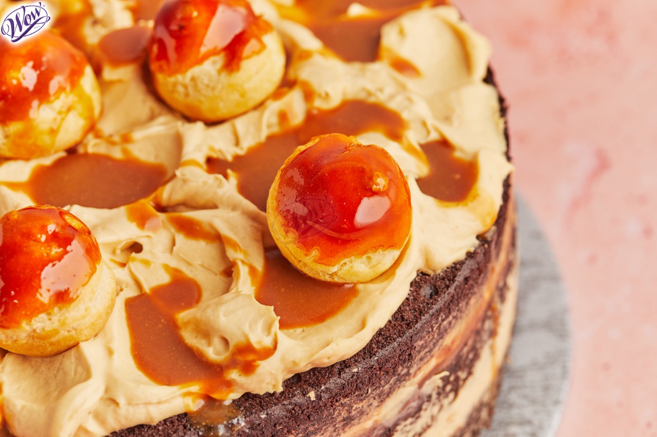 Chocolate Burger Sponge With Caramel Mousse And Profiterole On the Top.
